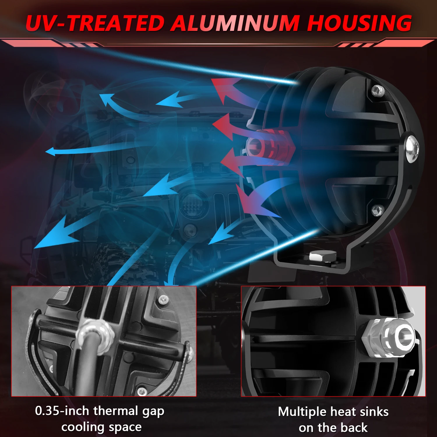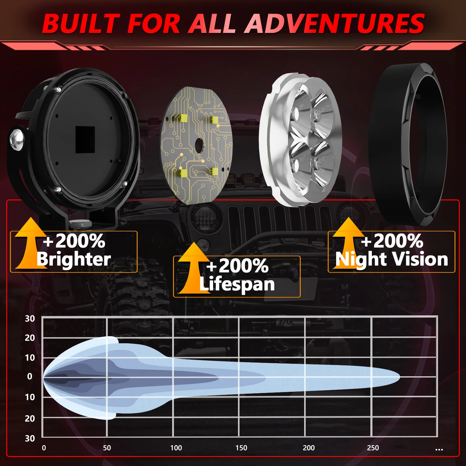 5. [Widely applicable] – DC 9-30V working voltage is suitable for various vehicles, such as off-road vehicles, almost compatible with all Jeeps, cars, trucks, motorcycles, SUVs, ATVs, ships, etc. Many indoor and outdoor uses: garden lighting, backyard lighting, reversing lights, outdoor lighting, architectural lighting, agricultural vehicle lighting, etc